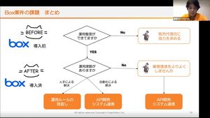 本セミナーでは、Box-APIを活用した周辺システムとのインテグレーション事例やRPA連携事例、自社開発したパスワード自動付与サービスをご紹介しながら、中小企業の業務改革につながるBox活用を解説していきます。