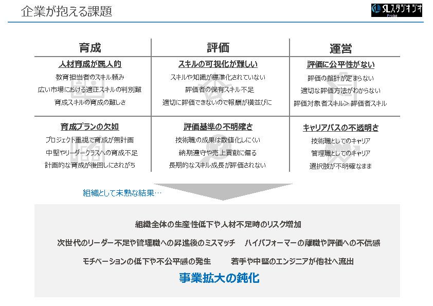 その点が不足してしまうと、自身のスキルセットに合ったアサインが行われないといった不満や、学習に取り組み続ける意義を見出せなくなり、離職やモチベーションの低下を招いてしまう恐れがあります。