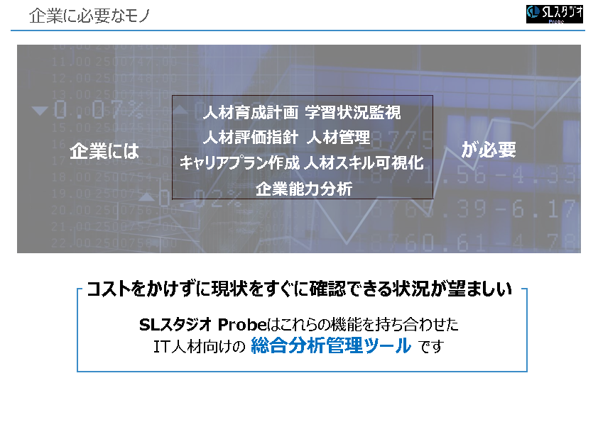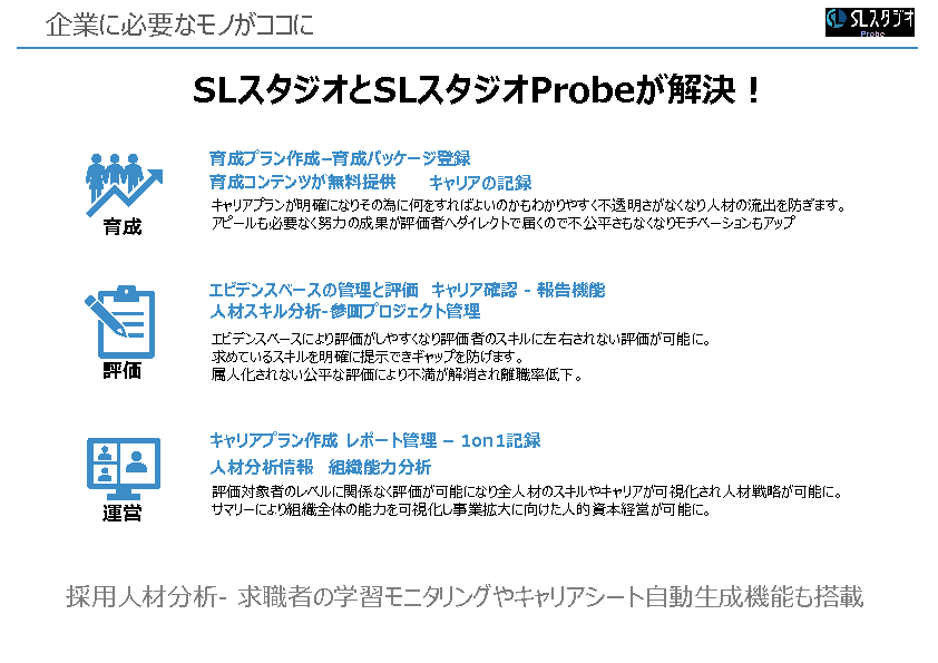 セミナーの中でご紹介する「SLスタジオProbe」は、個人のスキルや担当した案件はもちろん、面談結果や他者からの評価といった項目も紐づけが可能です。