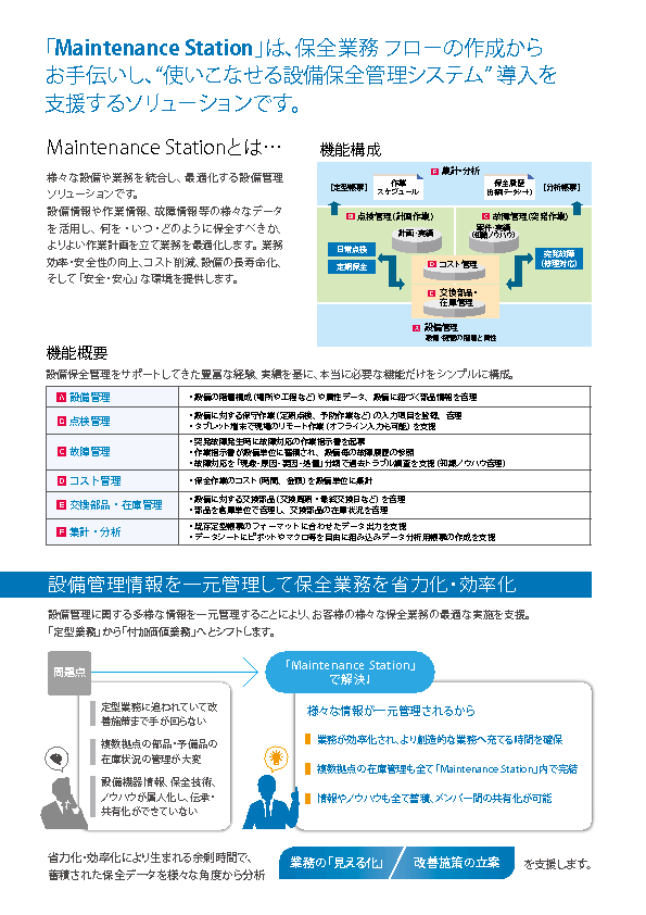 「ペーパーレスによる抜け・漏れ防止」、「設備情報の共有」等により、保全計画から点検・故障対応までの定型業務時間を削減し、分析・対策等の知的業務に充てることができます。