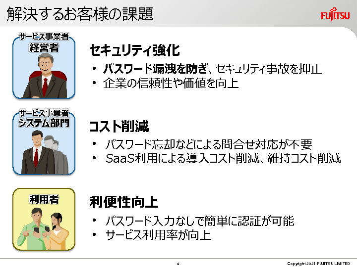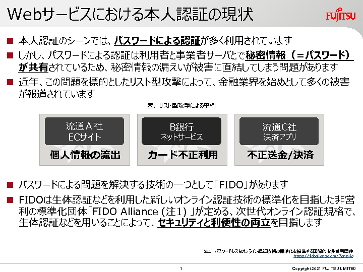 本セミナーでは、Webサービスの既存の認証の課題を解決するためにFIDO認証の仕組み、導入事例をご紹介いたします。