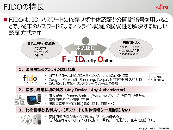 そこで注目されるのが、従来のパスワードに依存しない新たな認証の仕組み「FIDO」(ファイド:Fast IDentity Online=「素早いオンライン認証」)です。