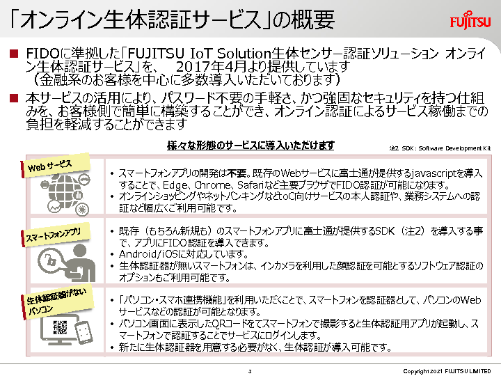 また、セミナーの中でFIDO準拠の富士通ソリューション「オンライン生体認証サービス」の体験デモも実施いたします。当デモでは受講者の方々がお手持ちのスマートフォン※を使って、FIDO認証の設定、利用を体験いただけます。