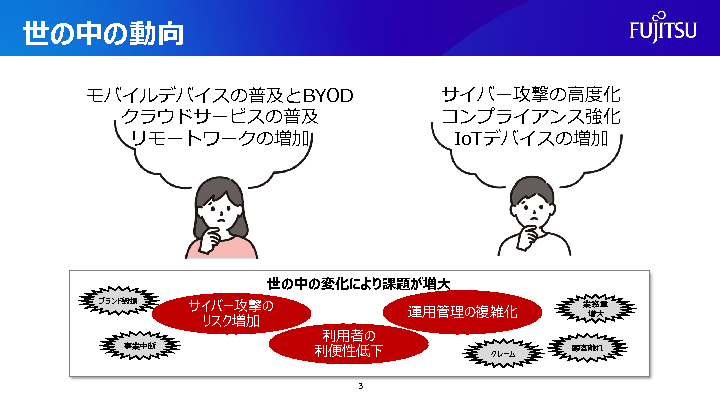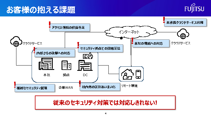 クラウド利用やリモートワークの普及により、企業ネットワークの境界は急速に曖昧化しています。従来の境界型防御は「社内は安全」という前提に基づくため、一度侵入を許すと被害が拡大しやすい構造的な弱点があります。加えて、サイバー攻撃は巧妙化し、内部脅威やゼロデイ攻撃など従来の防御モデルでは想定しきれないリスクが増加。多くの企業がゼロトラストの必要性を認識しているにもかかわらず、従来型防御からの転換は思うように進まず、脅威への対応が後手に回る状況が広がっています。