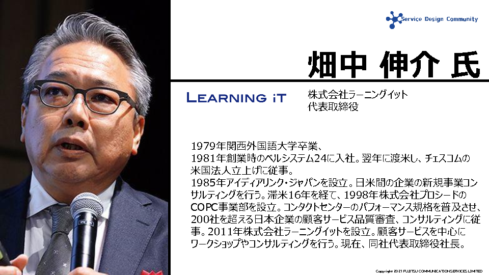 1985年アイディアリンク・ジャパンを設立。日米間の企業の新規事業コンサルティングを行う。滞米16年を経て、1998年株式会社プロシードのCOPC事業部を設立。コンタクトセンターのパフォーマンス規格を普及させ、200社を超える日本企業の顧客サービス品質審査、コンサルティングに従事。2011年株式会社ラーニングイットを設立。顧客サービスを中心にワークショップやコンサルティングを行う。現在、同社代表取締役社長。