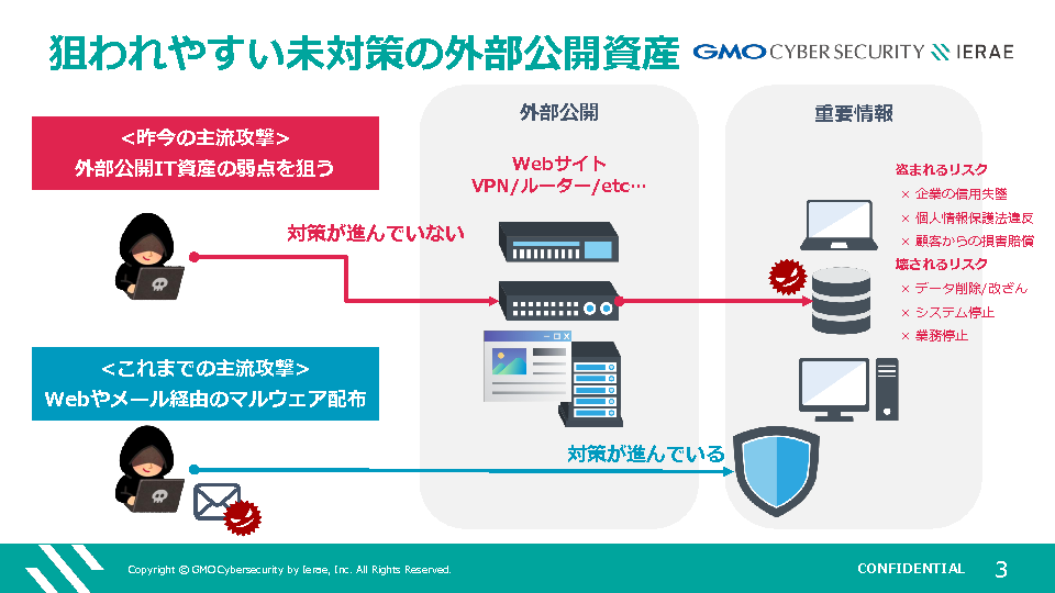 多くの攻撃者は、まず初めに公開されている情報やインターネットからアクセス可能な外部に公開しているIT資産から得られる情報を探り、攻撃対象や攻撃手法を検討します。