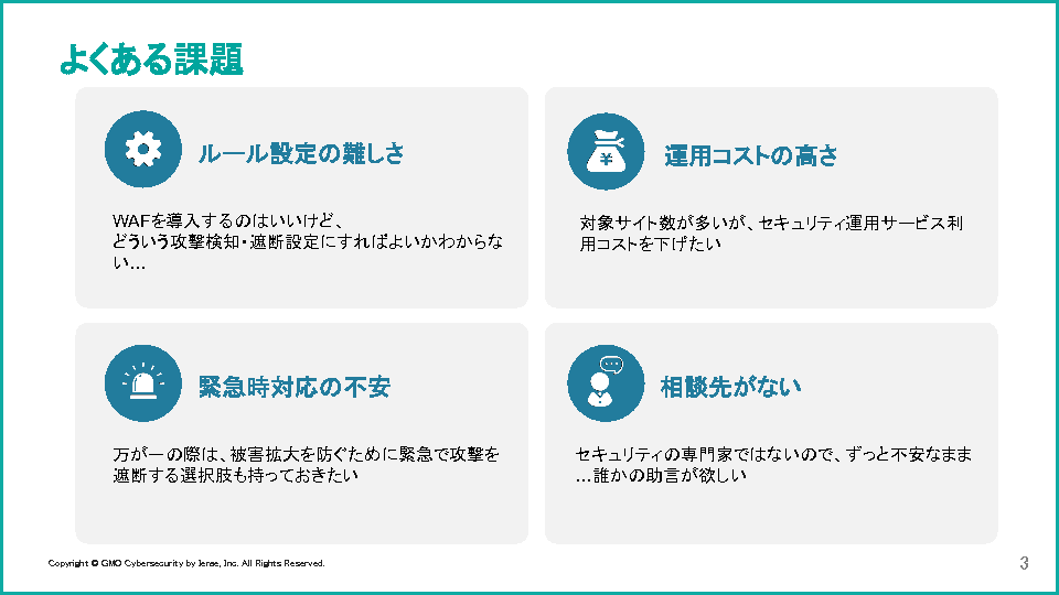 また、導入や運用にかかる費用、日々のセキュリティ業務の負担が重く、WAFの必要性は認識しつつも「面倒」「自動化したい」という理由で十分に活用されていない現場も見受けられます。それでは、AWS WAFの真価を発揮できているとは言い切れません。