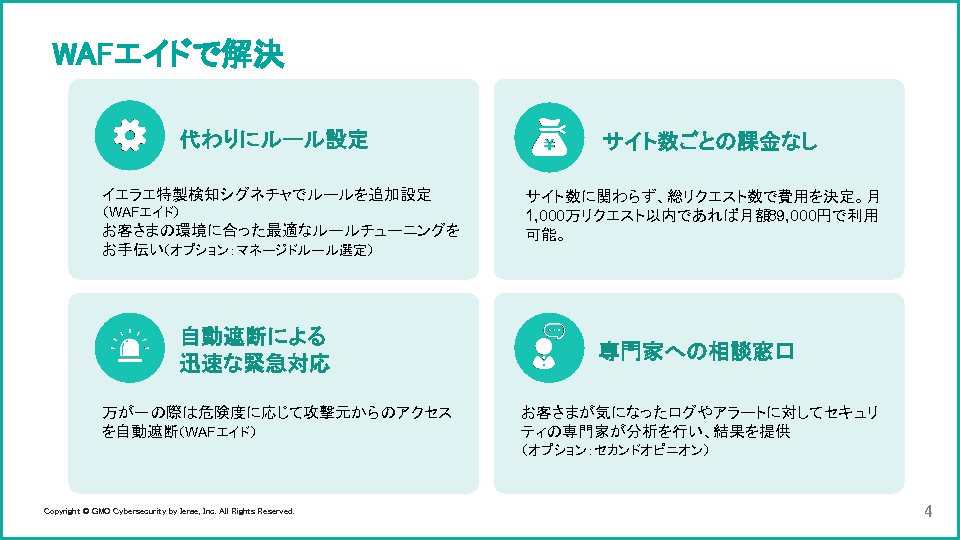 AWS WAFを導入しても、初期設定や運用方法に悩む企業は少なくありません。そこで本セミナーでは、AWS WAFの自動運用化によって、防御を効果的に維持するための最適な方法や留意点を解説します。さらに、GMOサイバーセキュリティbyイエラエが提供する「WAFエイド」をご紹介。世界屈指の技術力を持つ同社のセキュリティアナリストの知見を共有したり、独自開発の検知ルール(シグネチャ)を追加することで、セキュリティエンジニアでなくても高精度な運用が可能となる点など具体的な特長もご説明します。