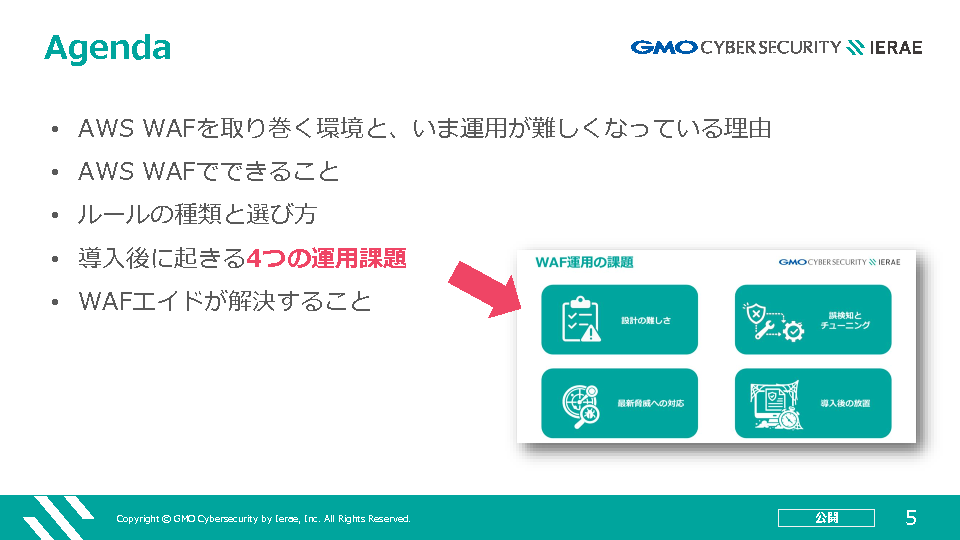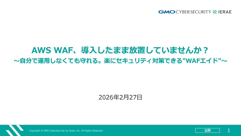 本セミナーでは、GMOサイバーセキュリティ byイエラエが提供する「WAFエイド」をご紹介します。AWS WAFの運用を24時間365日自動で行い、独自の検知ルール追加や攻撃元IPの自動遮断、専門アナリストへの相談などを提供するフルマネージドサービスで、お客様側で複雑な設定や運用を行う必要がなく、本来の業務に集中しながら高度なセキュリティ対策を実現できます。