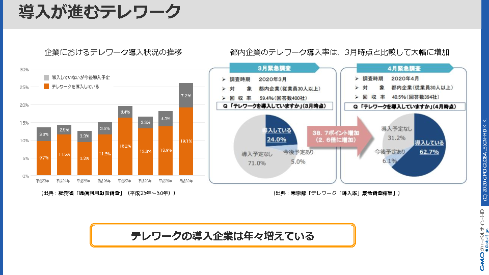緊急事態宣言時、企業は暫定的なテレワーク環境の構築を行いました。