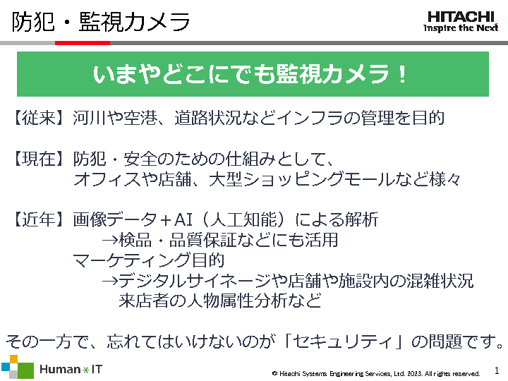 従来から河川や空港、道路状況などインフラの管理を目的に設置されてきた「カメラ」。現在は、防犯・安全のための仕組みとして、オフィスや店舗、大型ショッピングモールなど様々な場所にも導入されています。