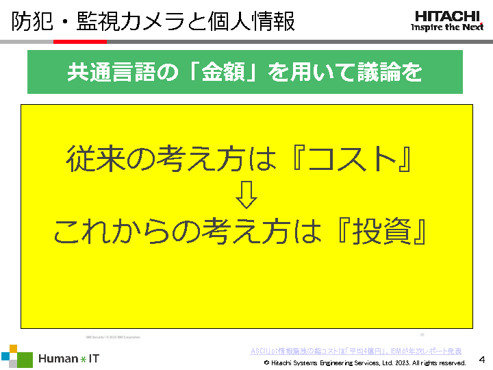 ある調査では、情報漏えい対応における総コストの平均は4億円にもおよぶと言われています。防犯・監視カメラを利用する際には、法律を遵守して適切なセキュリティ対策を施さなければいけません。