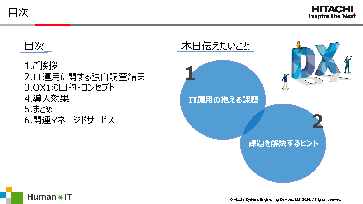 その上で、属人的なIT運用業務の改善を支援する新しいIT運用自動化ソリューションとして、2024年8月に提供開始した「OX1(Operations Transformation Service)」をご提案します。同ソリューションは、顧客企業の700社以上ものIT運用実績、50年のIT運用業務経験を基にしたIT運用のアウトソーソングサービスです。プレアセスメントから設計、運用までを含むトータルサービスとして、デジタル化したIT運用による現場の業務負担を大幅に削減します。