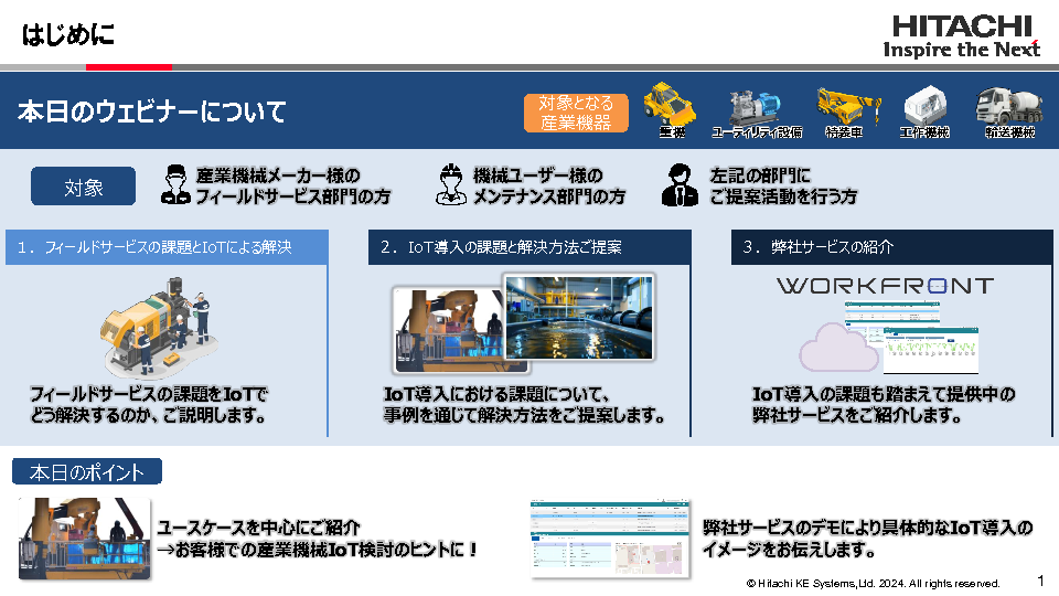 本セミナーでは、稼働監視サービス「WORKFRONT/CLOUD」を活用し、遠隔地の建機、農機、工場設備といった産業機械の稼働状況をリモートで効率的かつリアルタイムに可視化する方法を、具体的な事例を交えて詳しくご紹介します。