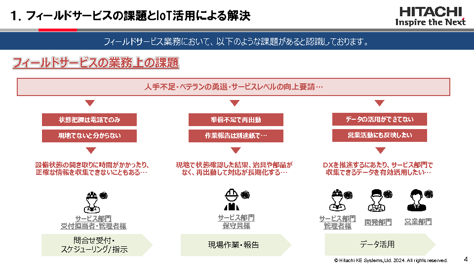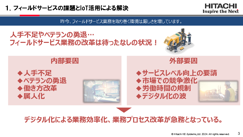 近年の少子高齢化による労働人口の減少や労働者の高齢化に伴い、産業機械の機器の保全や現場でのメンテナンス、トラブルシューティングを担うフィールドエンジニアの不足が深刻化しています。