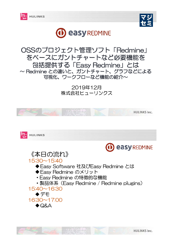 本セミナーでは、Easy Redmine についてご紹介するとともに、オープンソース版のRedmineとの違いや、Easy Redmine の価格について解説します。
