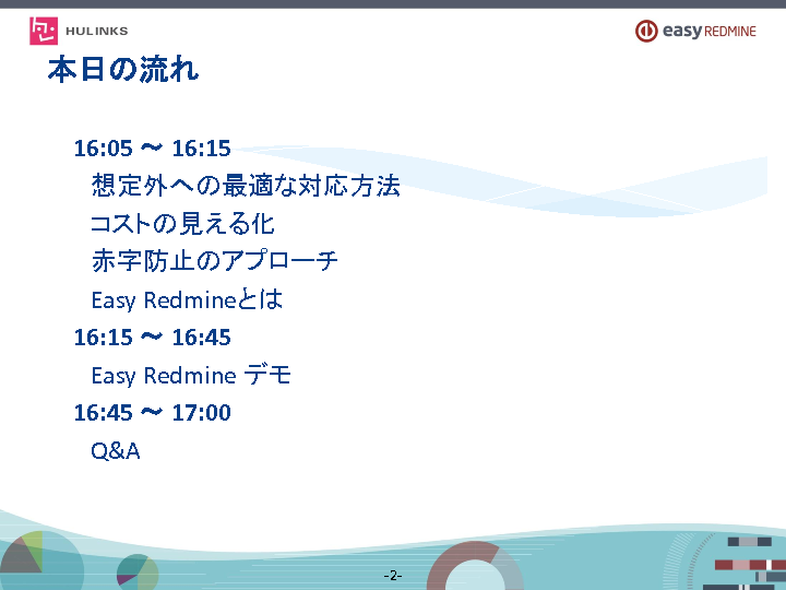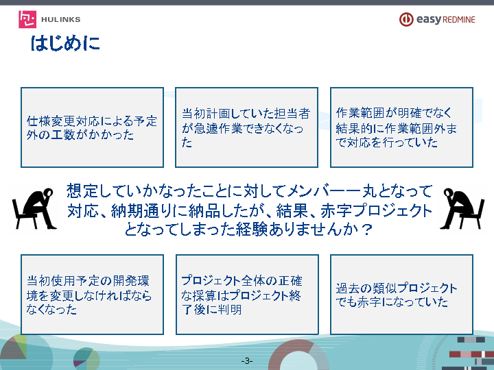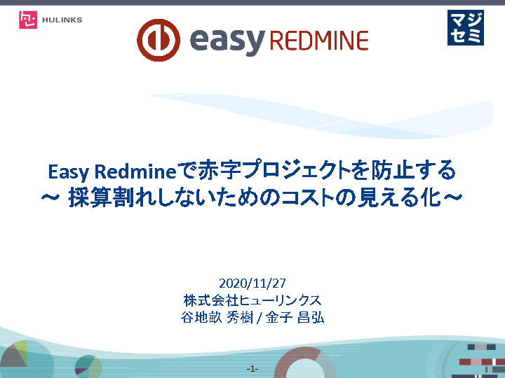 本セミナーでは、採算割れしないためのプロジェクト管理について、ITプロジェクト管理を例にEasy Redmineの使用方法のデモを交えながらご紹介します。