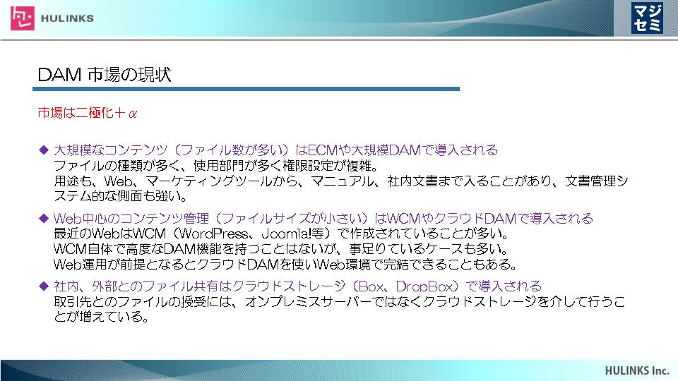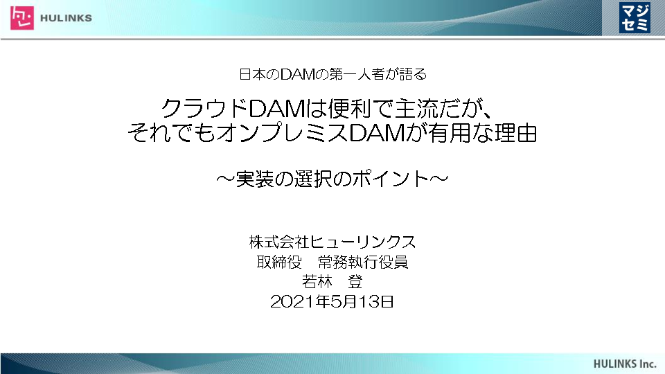 日本のDAM市場の黎明期から関わってきたヒューリンクス担当者が、SIer・システム導入責任者向けの検討ポイントを俯瞰的に解説いたします。