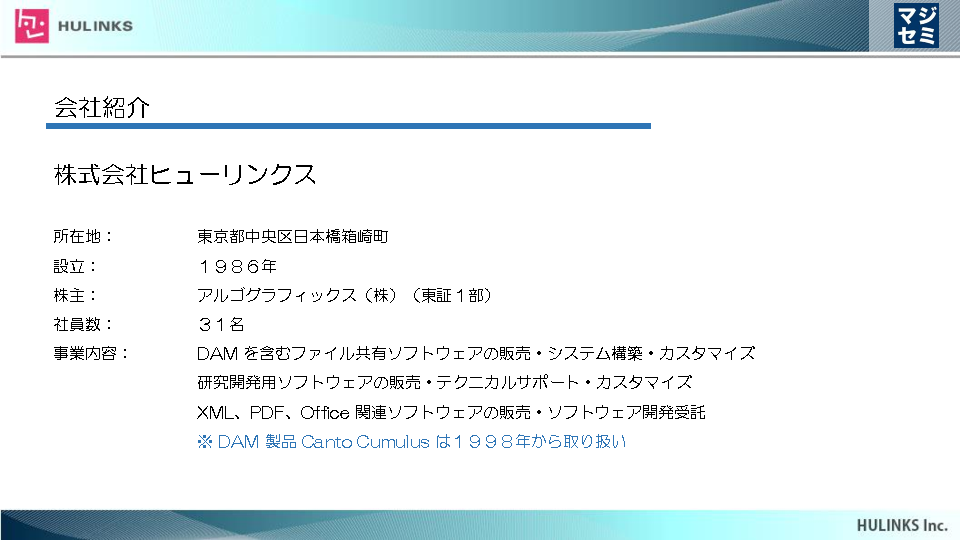 ヒューリンクス社で販売からシステム構築まで行っている「Canto Cumulus」の製品紹介を少しだけ行います。