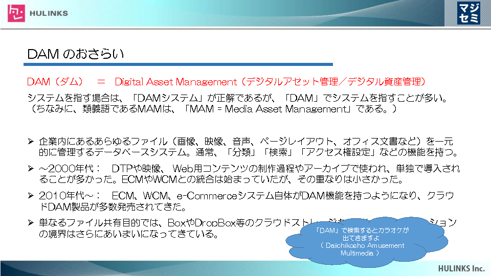 「DAM」とは「Digital Asset Management」の略語で、歴史はあるのものの広く普及しているとは言えません。DAMとは何か?を最初に少しおさらいします。
