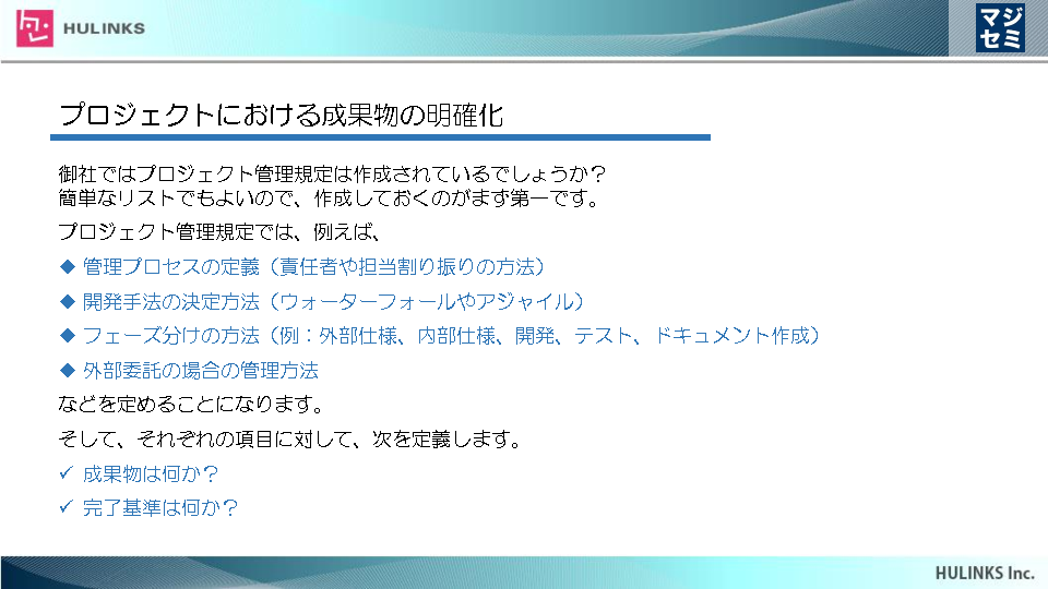 企業によってはプロジェクトを進行するうえで、手順や成果書類を規定した「プロジェクト管理規定」などが整備されていると思います。規定集がない企業でも、例えば、「仕様書のテンプレート」などが準備されていることでしょう。