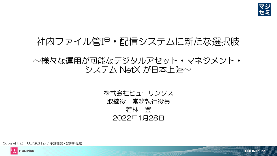 本セミナーでは、社内ファイル管理・配信システムの新たな選択肢として NetX を、デモを交えながら紹介いたします。