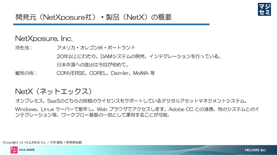 NetX は、10 年以上にわたる導入実績を持つデジタルアセットマネジメントシステムです。これまで、SaaS 版を利用してきたグローバル日本企業はいくつかありましたが、この度、オンプレミス版が日本に上陸し、さらに開発やシステムインテグレーションの提供をヒューリンクスで行うこととなりました。