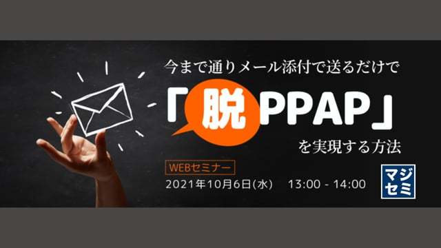 また、テレワークの普及で働く環境が変化している中、企業のセキュリティレベルの向上につながるヒントもご提案。脱PPAPをより簡単に実現できる方法をお探しの方は、ぜひご参加ください。