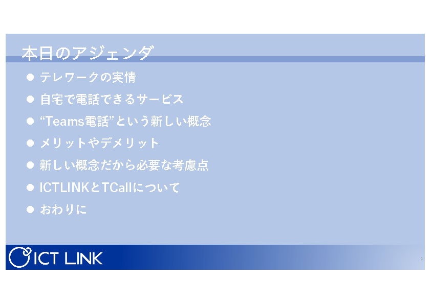 本セミナーでは、アイシーティーリンクが提供する、Microsoft Teamsを利用した電話回線サービスである「TCall」を用いて、テレワークで課題となる固定電話の課題を解決する方法を紹介します。