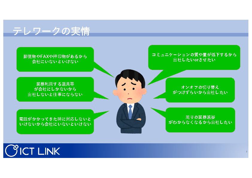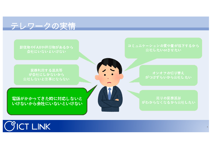 テレワークを日常的に行うようになると、従来のようにオフィスに設置している固定電話をどうするか、という問題が出てきます。