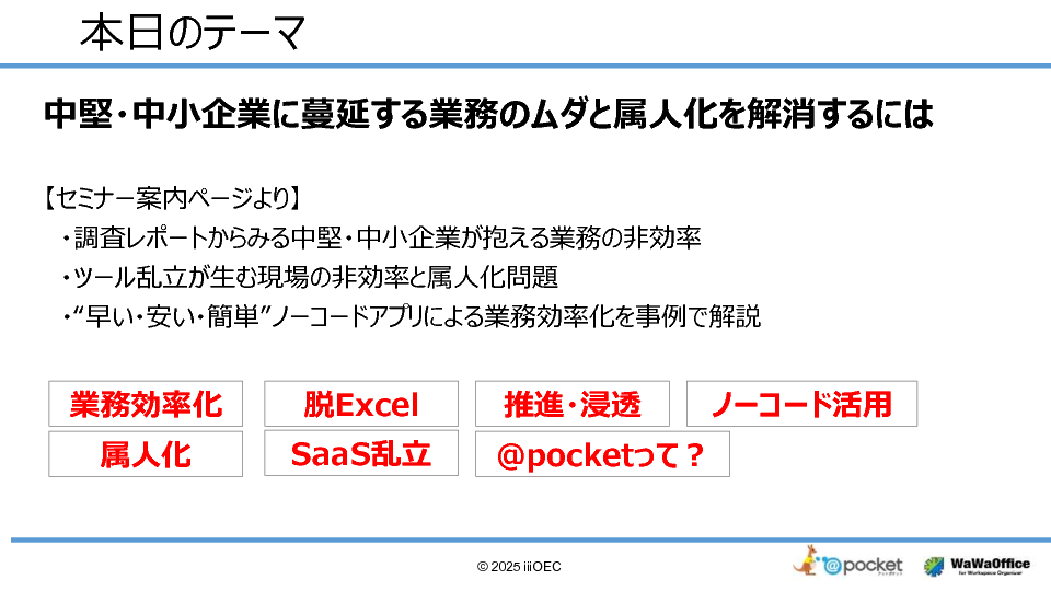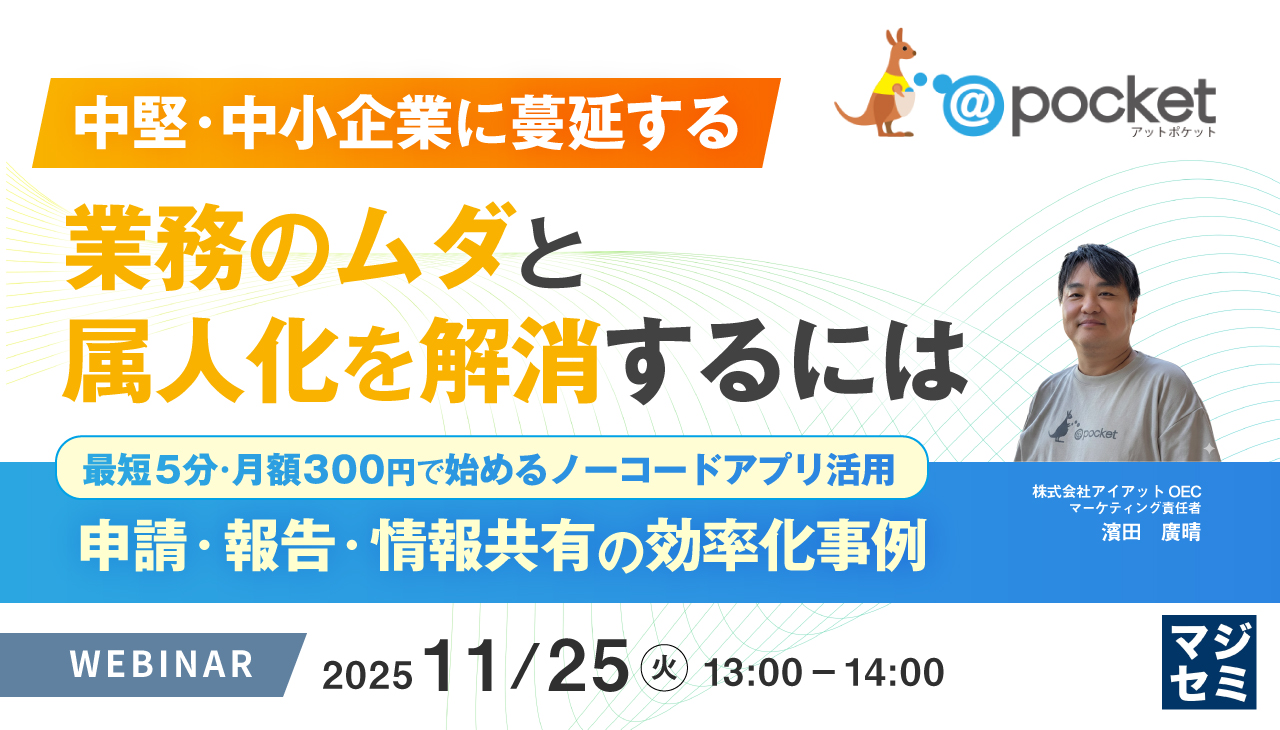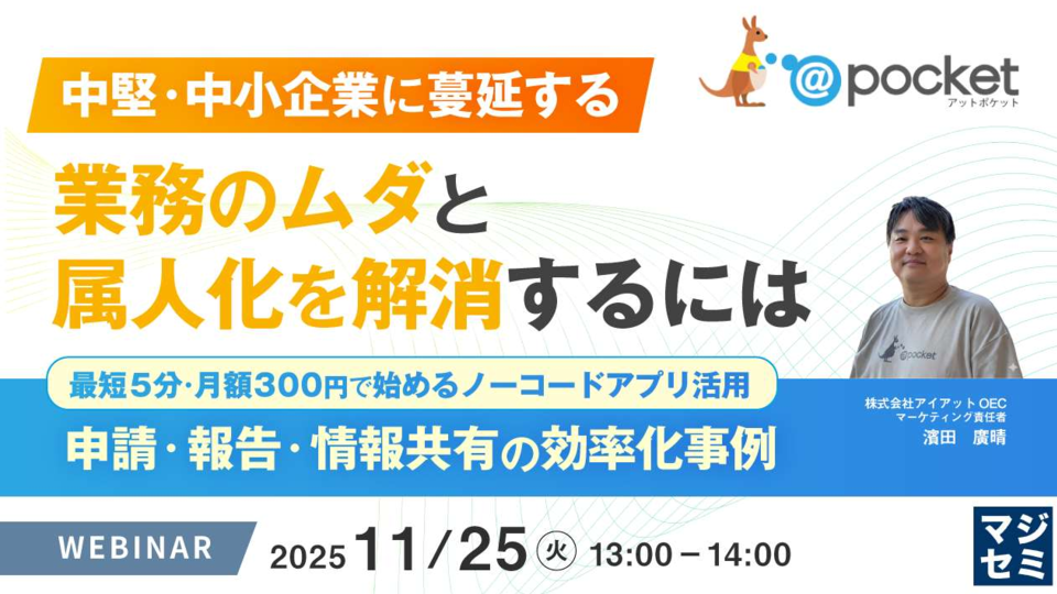 本セミナーでは、 プログラミング不要で 最短5分から始められるノーコードアプリ「@pocket」 を活用し、中堅・中小企業が抱える業務の非効率をどのように解消できるかを、調査レポートのデータと実際の導入事例を交えて解説します。 初期費用0円・月額300円という低コストで導入 でき、申請・報告・進捗管理・情報共有などの定型業務をまとめて効率化。