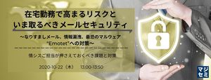 本ウェビナーでは、なりすましメール・マルウェア感染の動向を踏まえ、在宅勤務が普及したいま企業に求められる脅威メールへの対策、メール誤送信などの情報漏洩対策をご紹介します。