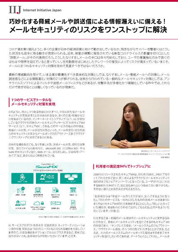 外部からの脅威対策と、内部情報の漏洩対策の両面でのセキュリティ管理が必須となってきています。セキュアMXサービス(以降、SMX)はMicrosoft365, G Suiteにも対応しているクラウド型メールセキュリティです。