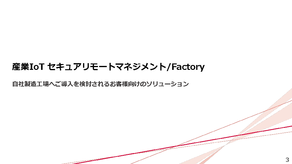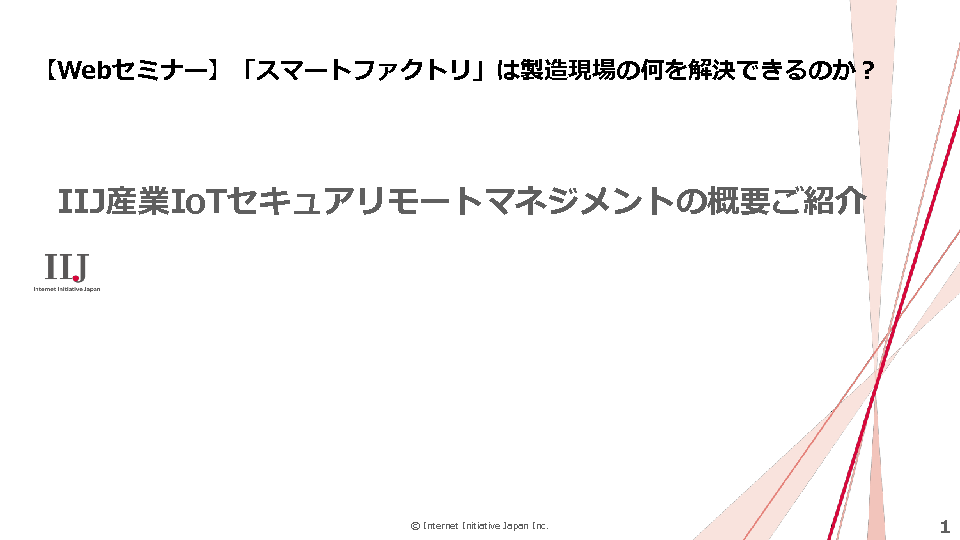 本Webセミナーでは「産業IoTセキュアリモートマネジメント」の概要説明とともにIoT導入事例を紹介することで『「スマートファクトリ」で製造現場の何を解決できるのか?』について解説致します。