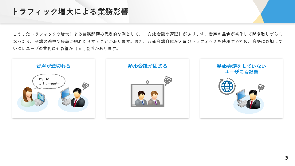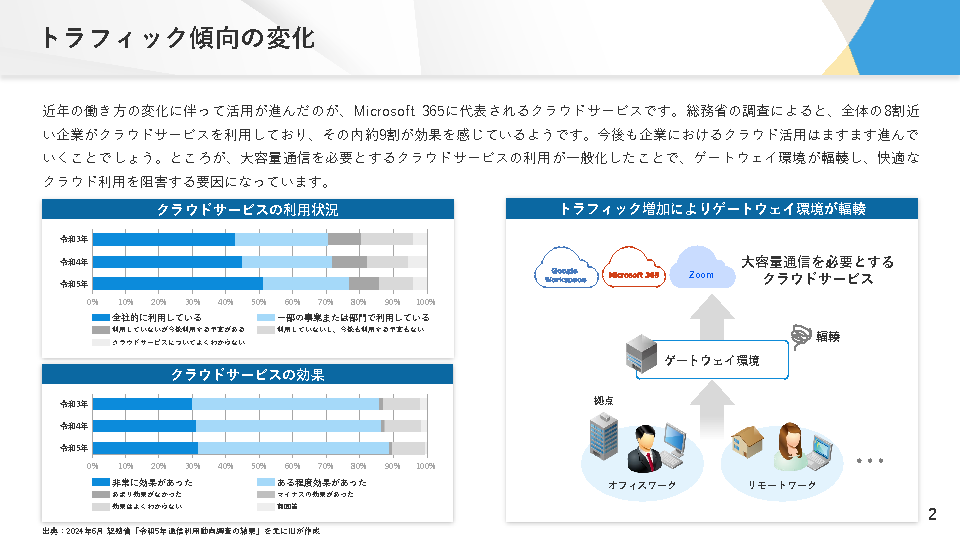 DX(デジタル変革)の推進やハイブリッドワークの拡大により、「Box」をはじめとするオンラインストレージの利用が一般化しています。これまで社内ネットワーク内で完結していたファイル共有や保存が、クラウド上で頻繁に行われるようになり、大容量ファイルの転送通信が新たに発生。結果として拠点ごとのインターネット帯域がひっ迫し、ネットワーク機器への負荷増大が通信遅延の要因になることも起きています。