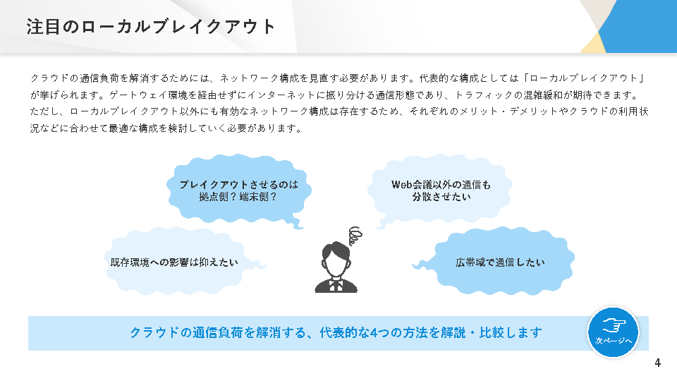 本セミナーは、Boxを利用中または導入予定で、拠点の帯域不足や通信品質に課題を感じている企業・組織の情報システム部門・ITインフラ担当者の方を対象に開催します。課題解決策として「LBO(ローカルブレイクアウト最適化)」を提案。LBOによって拠点から直接クラウドへ安全にアクセスさせることで、インターネット帯域のひっ迫や通信遅延を軽減します。