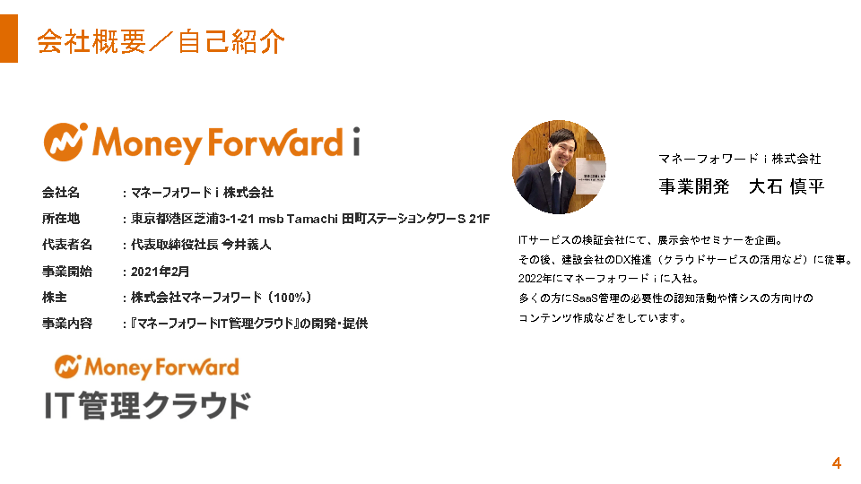 社内でご利用されているGoogle Workspace / Microsoft365 / AzureAD / SmartHR / Oktaと連携して、SaaS管理者の業務負荷を減らしつつセキュリティも強化できる、マネーフォワードi社のソリューション『マネーフォワード IT管理クラウド』をご紹介する予定です。