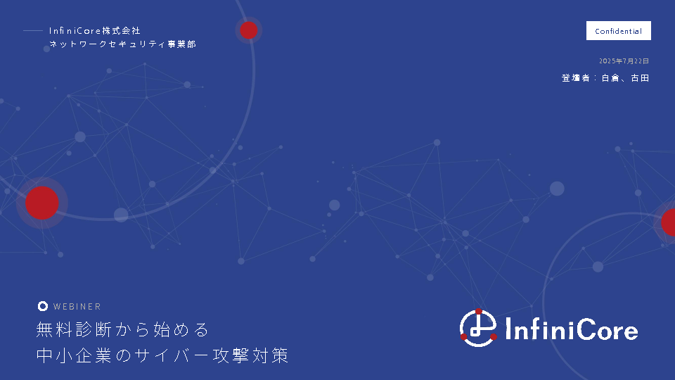 本セミナーでは、ランサムウェアやVPNの脆弱性、クラウド活用時のセキュリティ不備といった現実的な脅威を分かりやすく解説します。加えて、クラウド型ゼロトラストセキュリティ「InfiniProtect」を活用し、面倒な運用負担なしで全通信を保護する実践的なアプローチをご紹介。導入のステップや運用のイメージも具体的にご説明します。さらに、セミナー参加者には自社のリスクを可視化できる「無料診断」を提供し、すぐに始められる対策の第一歩をサポートします。