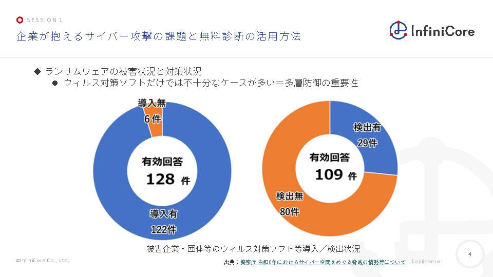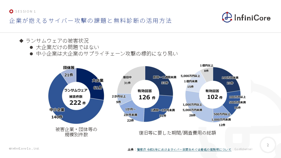 サイバー攻撃は日々巧妙化し、ランサムウェアや標的型攻撃に加え、VPNの脆弱性やリモート端末を狙う手口も増加しています。従来は大企業が主な標的でしたが、近年では対策が手薄な中小企業が重点的に狙われています。IPAの「情報セキュリティ10大脅威 2025」にも見られる通り、業種や規模に関係なく、あらゆる企業がリスクに晒されています。今やサイバーセキュリティは経営課題のひとつであり、限られたリソースの中で、いかに迅速かつ実効性のある対策を講じるかが問われています。