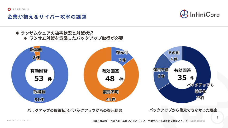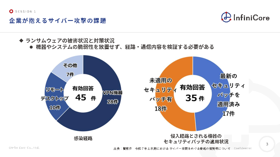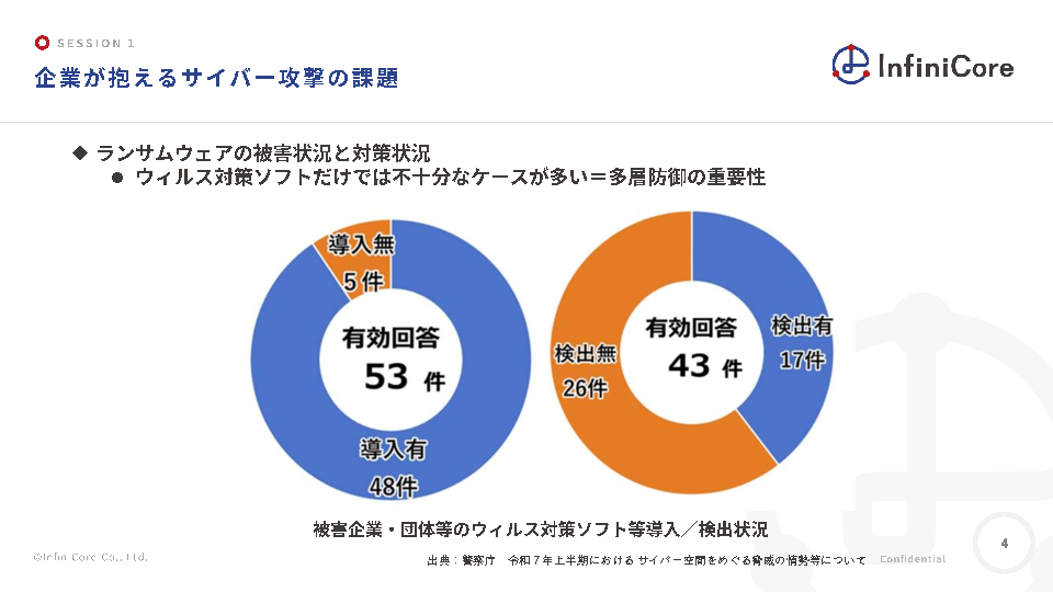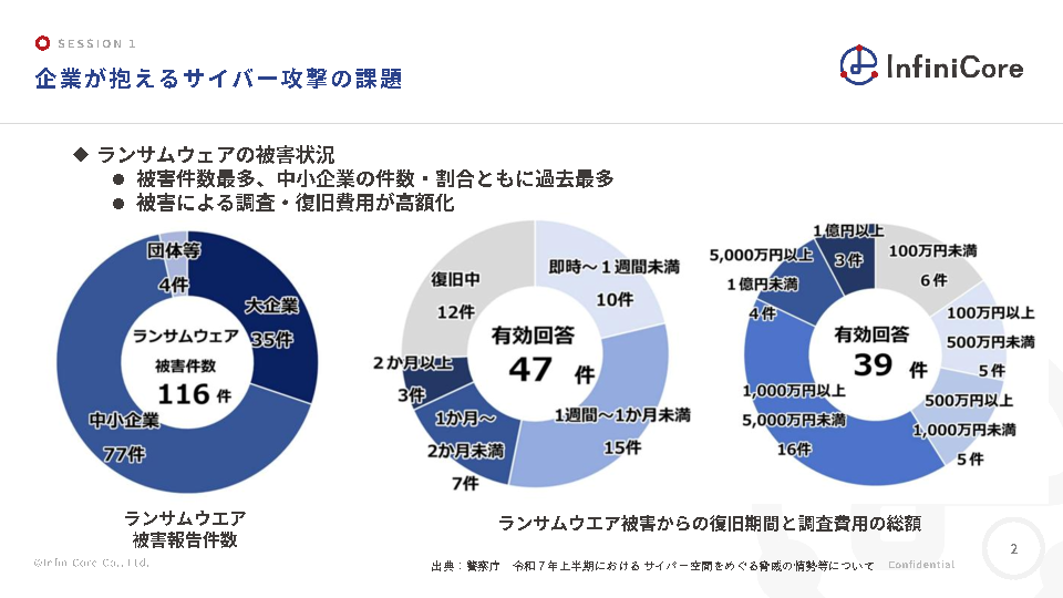 サイバー攻撃は日々巧妙化し、ランサムウェアや標的型攻撃に加えて、VPNの脆弱性やリモート端末を起点とした侵入など手口が多様化しています。従来は大企業が主な標的と見なされがちでしたが、近年は対策が手薄になりやすい中小企業が狙われるケースも増え、業種や規模を問わずリスクに晒される状況です。いまやサイバーセキュリティは「IT担当だけの課題」ではなく、限られた人員・予算の中で実効性のある対策をどう早く回すかが問われる経営課題の一つになっています。
