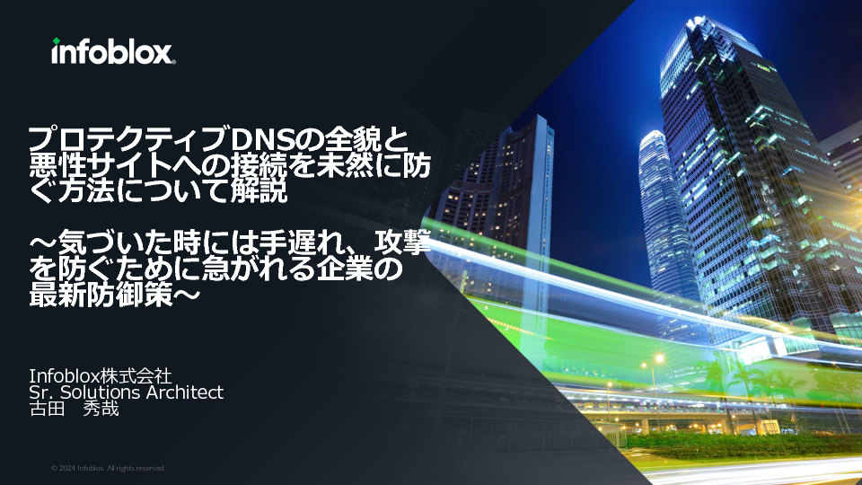 従来のエンドポイントなどのセキュリティ対策だけでは防げないDNS攻撃を防ぐための最新技術として、Infoblox Threat Defenseを用いたプロテクティブDNSについて詳しくご紹介します。これにより、DNSトンネリングやその他の悪意ある通信を未然に防ぎ、攻撃者がDNSを悪用して行う不正アクセスやデータ漏洩を防ぐ実際の事例と共に、効果的な対策の立て方をご紹介します。