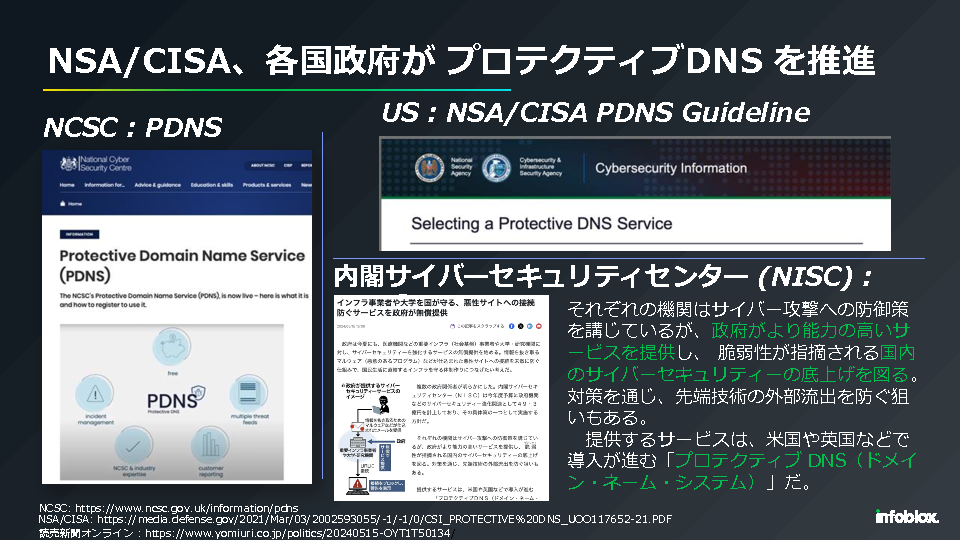 近年、DNSを悪用したサイバー攻撃が増加し、企業のセキュリティに深刻な影響を与えています。特にDNSトンネリングなどの手法は従来の対策では検知が難しく、多くの企業が被害を受けています。こうした状況を受け、内閣サイバーセキュリティセンター(NISC)は、サイバーセキュリティ強化策として「プロテクティブDNS」の導入を推進し、悪性サイトへの接続を未然に防ぎ、企業のセキュリティ強化を促進しています。