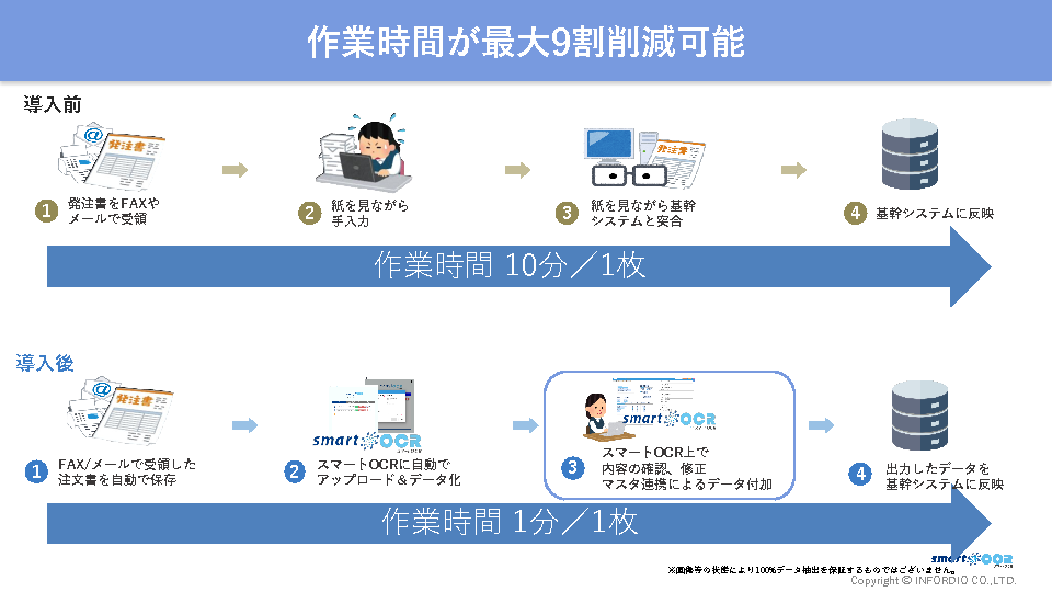 また、注文書におけるAI-OCRの場合は、注文書を受けてからデータをスキャンするまでや、スキャンしたデータを格納するまでを自動化処理できないと、本当の意味で「手作業をなくす」ことにはなりません。