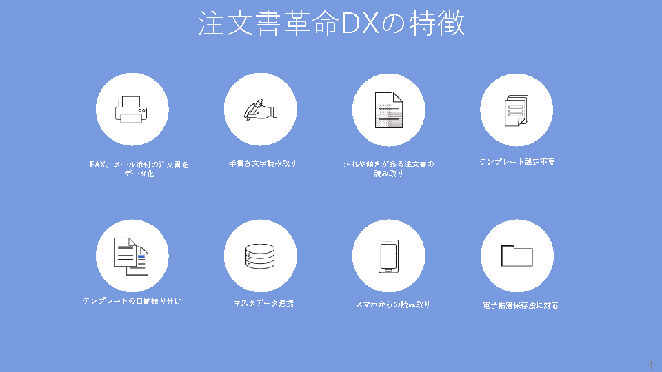 注文書革命DXは注文書に特化したAI-OCRです。そのため、注文書を受け取るところからデータを基幹システムに導入するまで一貫した対応が可能で、RPAの導入も不要です。