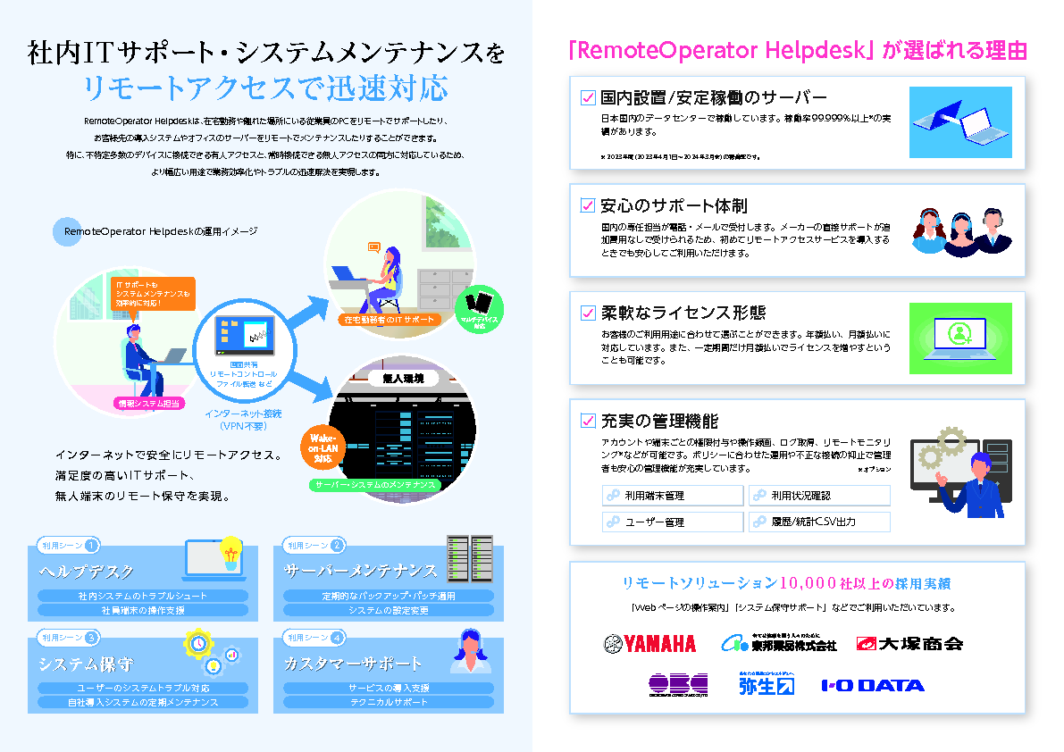 これまで電話で行っていた操作説明やトラブル対応、直接現場に出向いていたサーバー保守などをIT担当者のPCから行えることで、サービス品質の向上やコスト削減につながります。