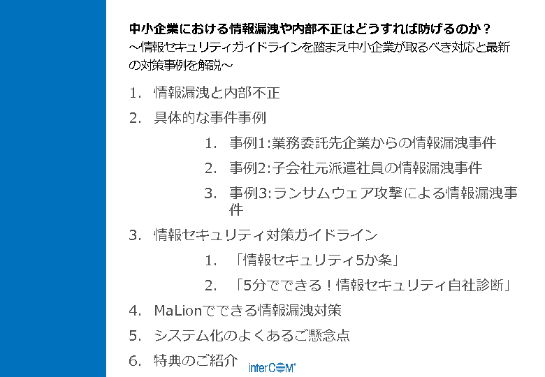 本ウェビナーでは、企業内部での行動が原因となるセキュリティ事故の防止を目的とした「MaLionCloud」をご紹介いたします。