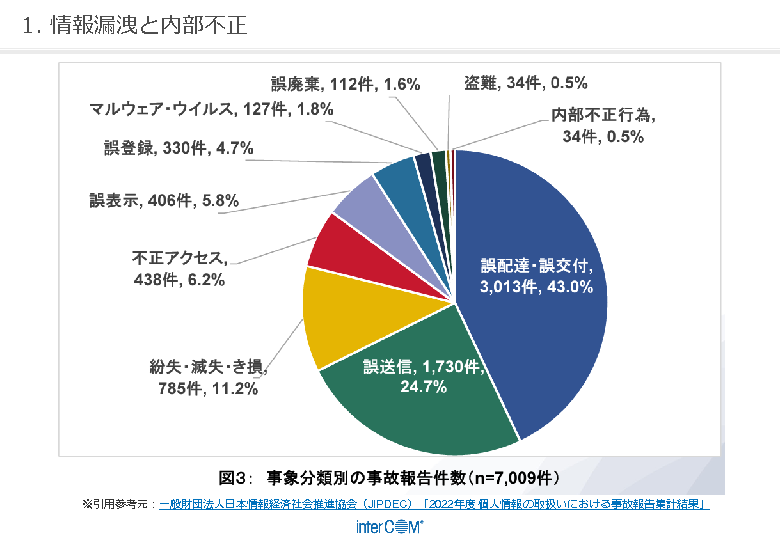 ランサムウェアやサプライチェーン攻撃といった、外部からの攻撃に次いで「内部不正による個人情報漏洩」の事故件数が多いことが報告されています。