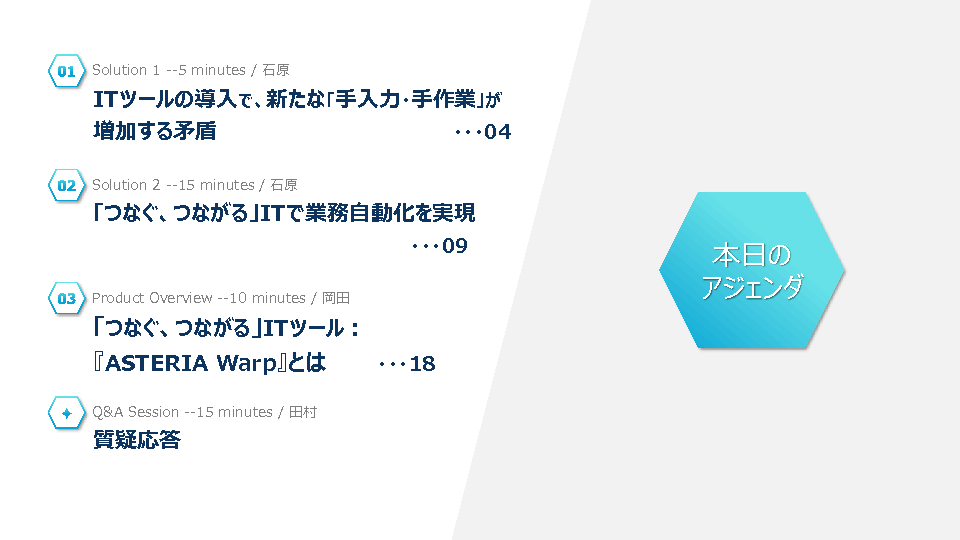 本セミナーでは、ノーコード技術でDX実現を支援する『ASTERIA Warp』を活用し、業務自動化・効率化の妨げとなっているシステムとシステムの間の「手入力・手作業」を解消する具体的な方法をご紹介いたします。