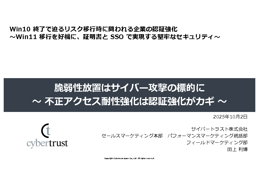 11:05~11:45 Win10終了で迫るリスク、移行時に問われる企業の認証強化〜Win11移行を好機に、証明書とSSOで実現する堅牢なセキュリティ〜