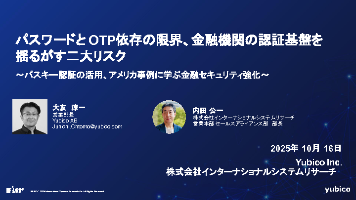 12:05~12:45 パスワードとOTP依存の限界、金融機関の認証基盤を揺るがす二大リスク〜パスワードレス認証とYubiKey活用、アメリカ事例に学ぶ金融セキュリティ強化〜